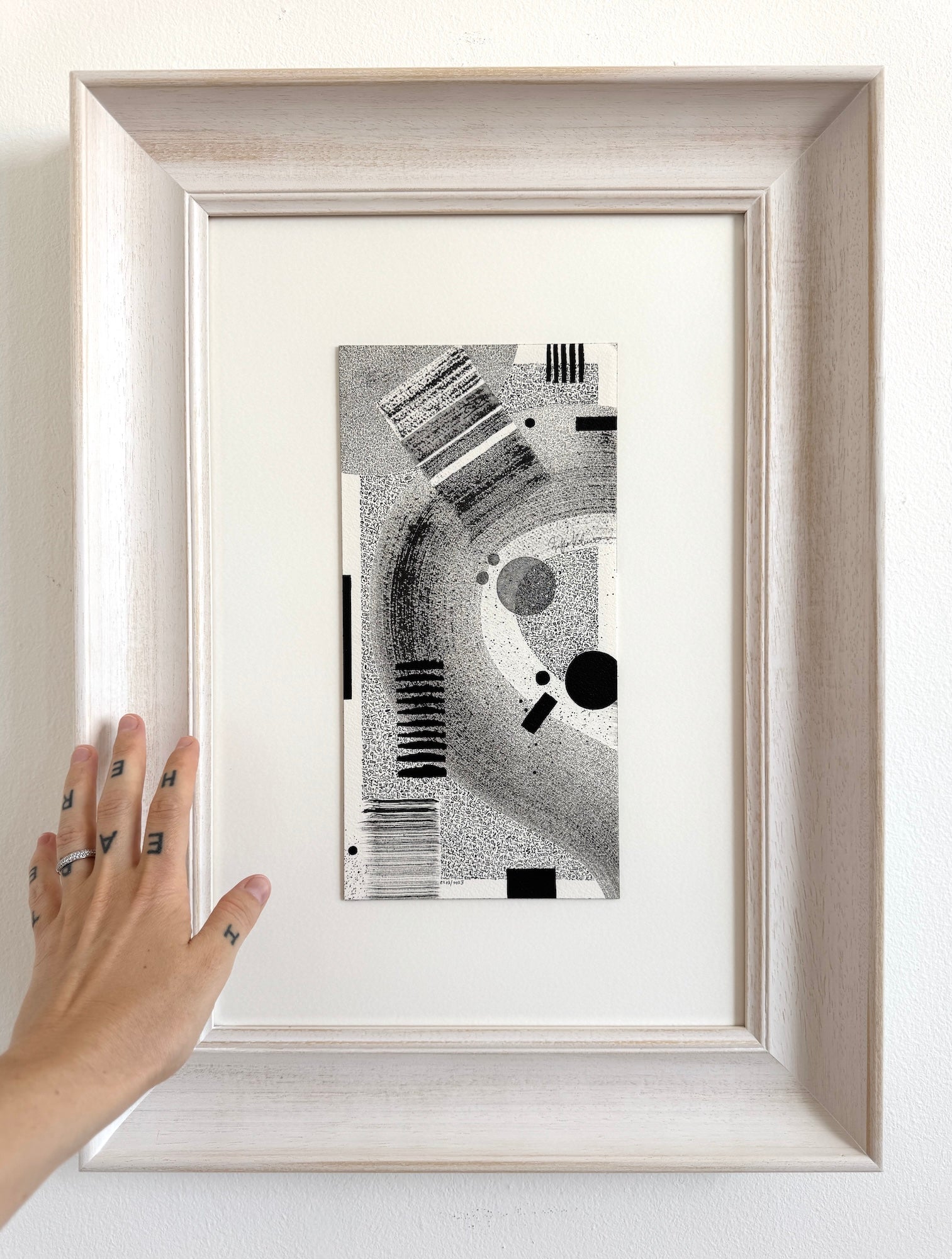 The artwork is framed, slightly floated, in natural wood with archival quality matboard and museum non-reflective glass. This one-of-a-kind original artwork is hand-signed by the Artist and accompanied by a Certificate of Authenticity.