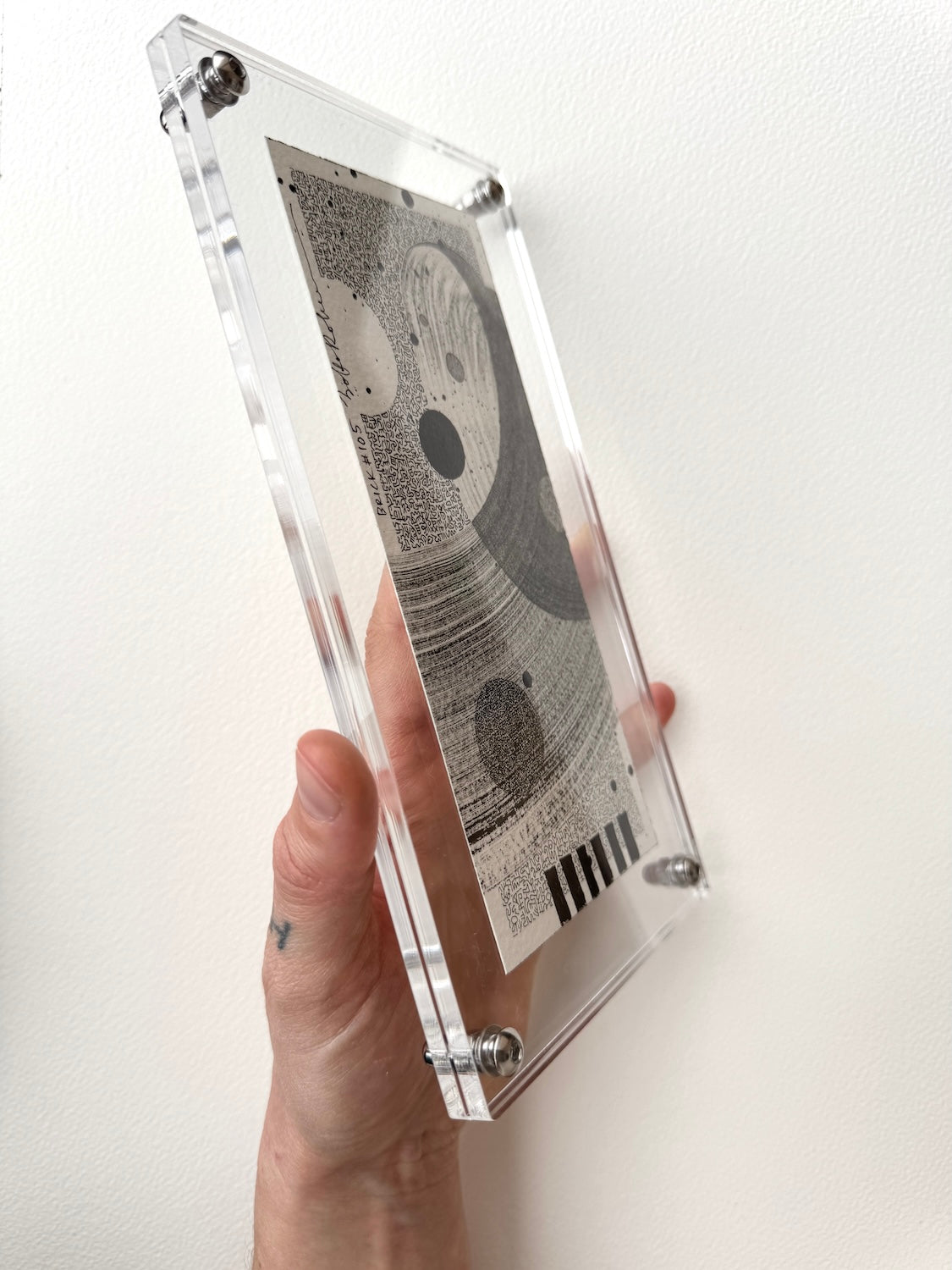 This artwork is framed between two removable clear acrylic sheets with a “hanging acrylic notch” attached to the back, for easy and functional wall hanging. The artwork can also be reframed to one's preference.