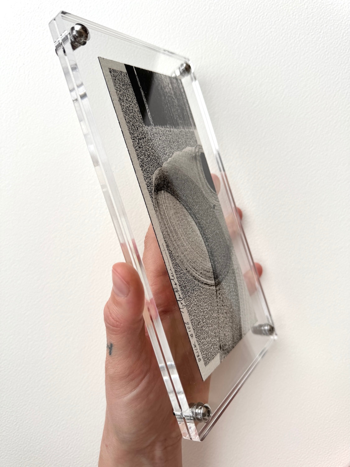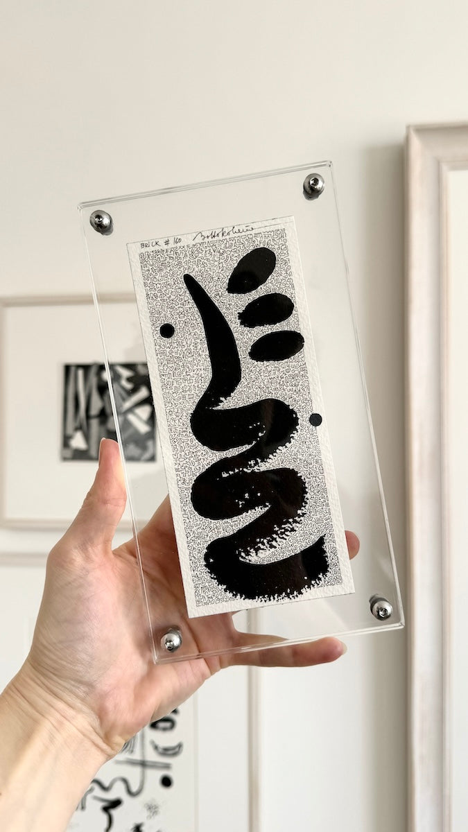 This artwork is framed between two removable clear acrylic sheets with a “hanging acrylic notch” attached to the back, for easy and functional wall hanging. The artwork can also be reframed to one's preference.