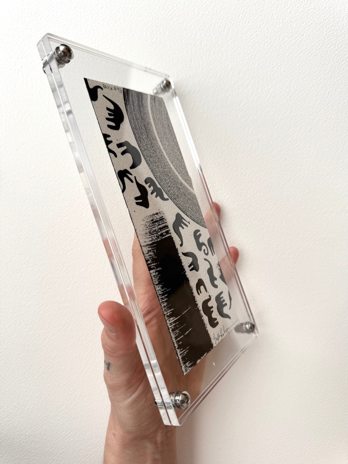 This artwork is framed between two removable clear acrylic sheets with a “hanging acrylic notch” attached to the back, for easy and functional wall hanging. The artwork can also be reframed to one's preference.