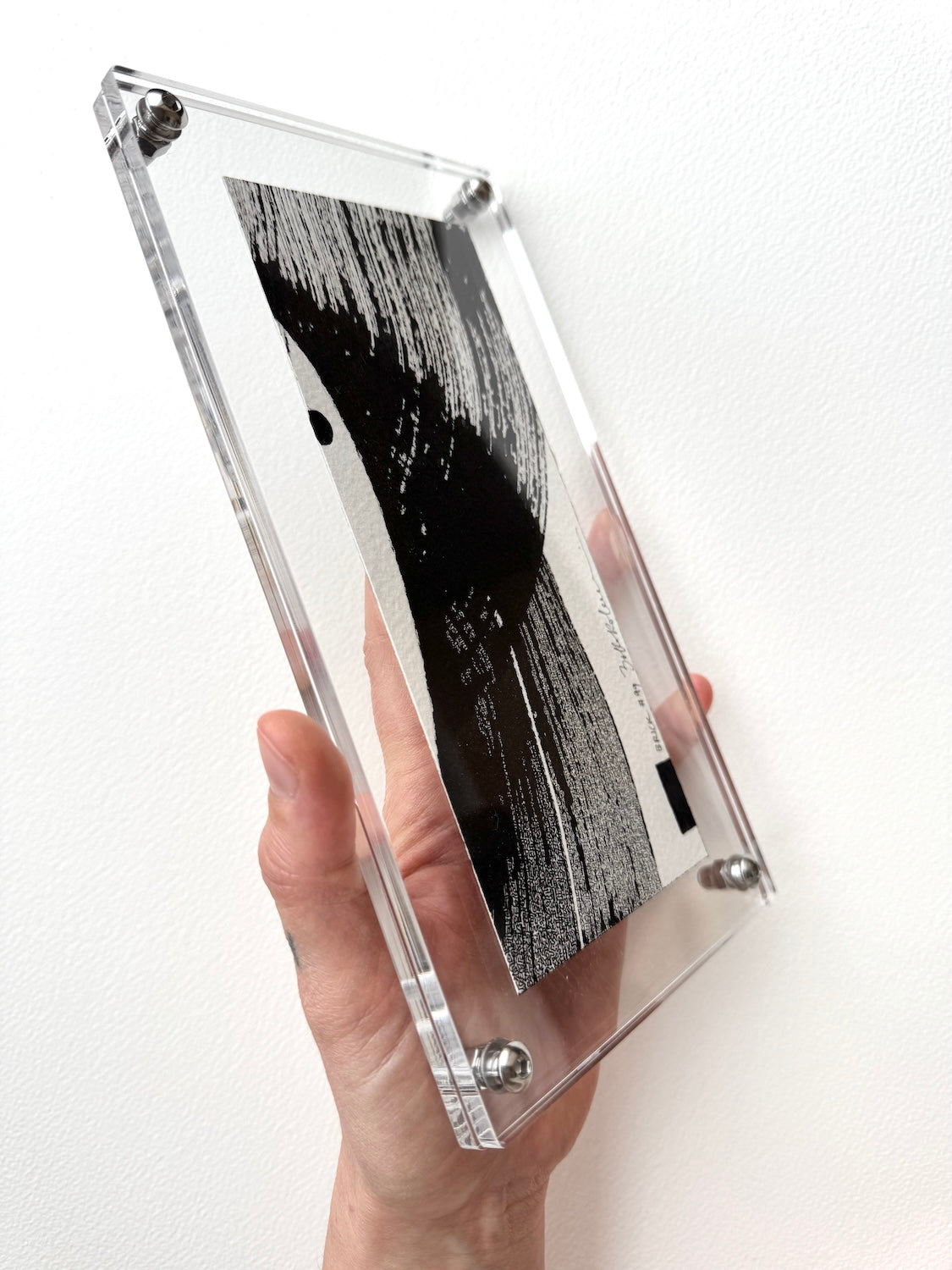This artwork is framed between two removable clear acrylic sheets with a “hanging acrylic notch” attached to the back, for easy and functional wall hanging. The artwork can also be reframed to one's preference.